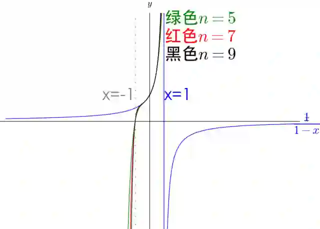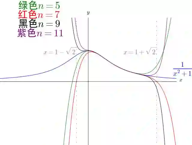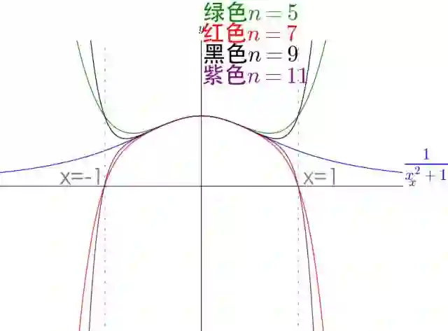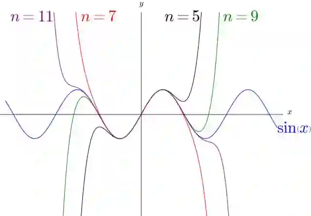 从图中可以看到,泰勒级数在 之间收敛。超出这个范围,泰勒级数的图像就远离原函数的图像。