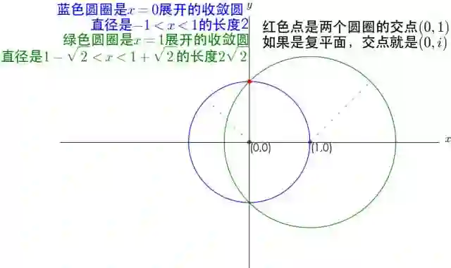对比这两个展开的收敛区间,看不出什么规律来,同样的画下收敛圆看看: