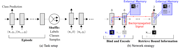 我们可以看到,网络的输入把上一次的y label也作为输入,并且添加了external memory存储上一次的x输入,这使得下一次输入后进行反向传播时,可以让y label和x建立联系,使得之后的x能够通过外部记忆获取相关图像进行比对来实现更好的预测。