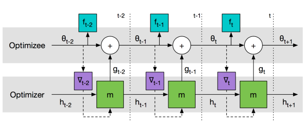 基本思路:LSTM内部的更新非常类似于梯度下降的更新,那么,能否利用LSTM的结构训练出一个神经网络的更新机制,输入当前网络参数,直接输出新的更新参数?这个想法非常巧妙。