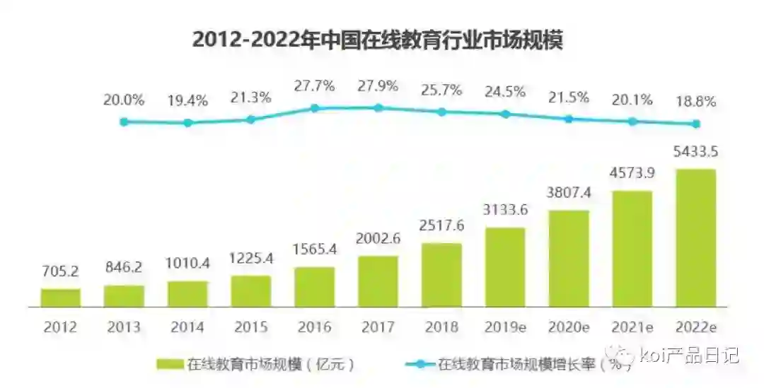 1)教育行业是一个万亿的巨大市场,其中在线教育行业的每年的增速保持在20%左右,预计2022年将突破5000亿大关,但从2016年开始,行业的增速放缓。