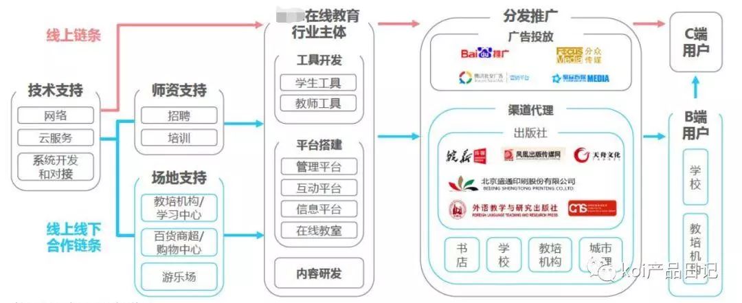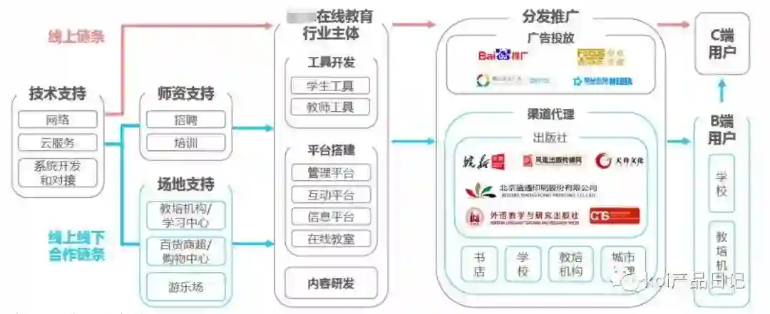 在分析行业的上下游,需要整理出自己的行业链条,教育行业的线上和线下链条如下图: