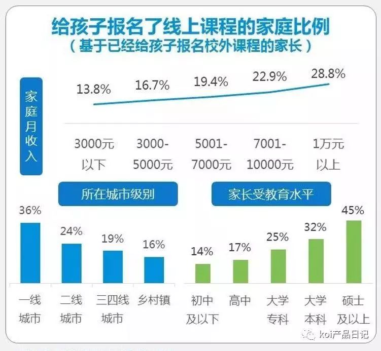 在线课程的渗透率与城市、家长学历、家庭收入都呈现明显的正相关。学历高、收入高、城市级别高的“三高”家长更愿意为孩子报线上课程,其中学历方面差距达到了3倍之多。