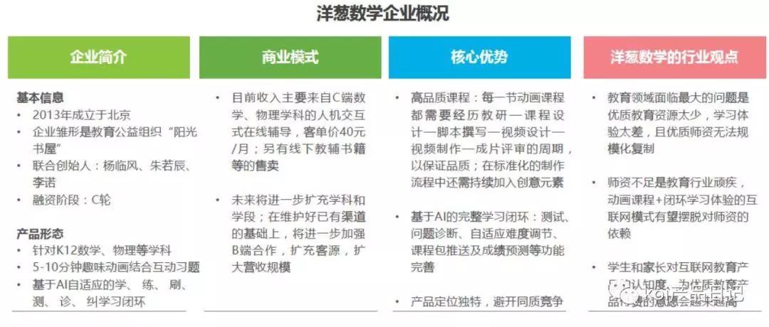 洋葱数学是2013年成立的公司,目前融资阶段为C轮,主要的产品是主要针对K12教学、物理等学科提供趣味动画习题为主要形式的人机交互在线辅导。