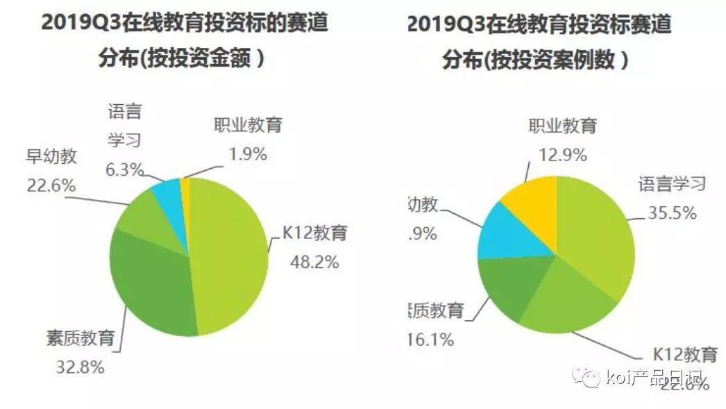 从2019第3季度教育行业投资的金额和比例来看,K12教育和素质教育获得了最多的投资金额,分别为:48.2%和32.8%;K12教育和语音学习获得了最多的投资数,分别为22.6%和35.5%。