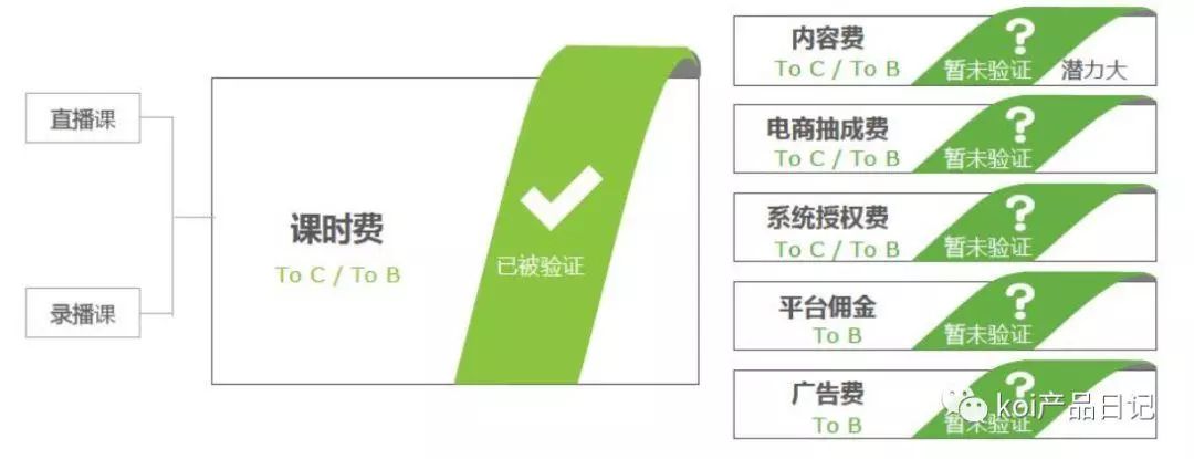 目前教育行业有课时费、内容费、电商、广告费等等模式,其中以课时费为主,它包括录播和直播两种形式。课时费之所以可行是因为它沿用了线下收费的方式,用户为内容效果付费。