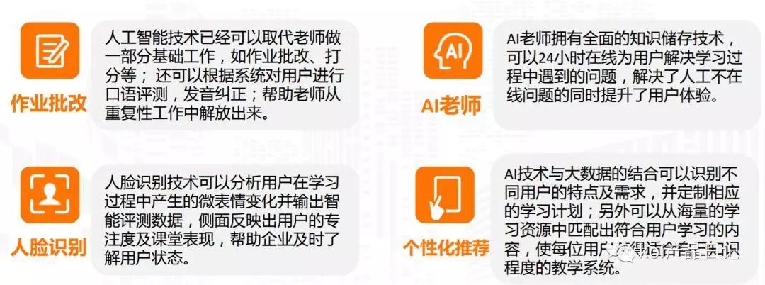 AI老师、AI批改作 业、人脸识别、个性化推荐等技术被众多教育企业运用在自身业务场景中,提升学习效率,为用户创造新的体验。