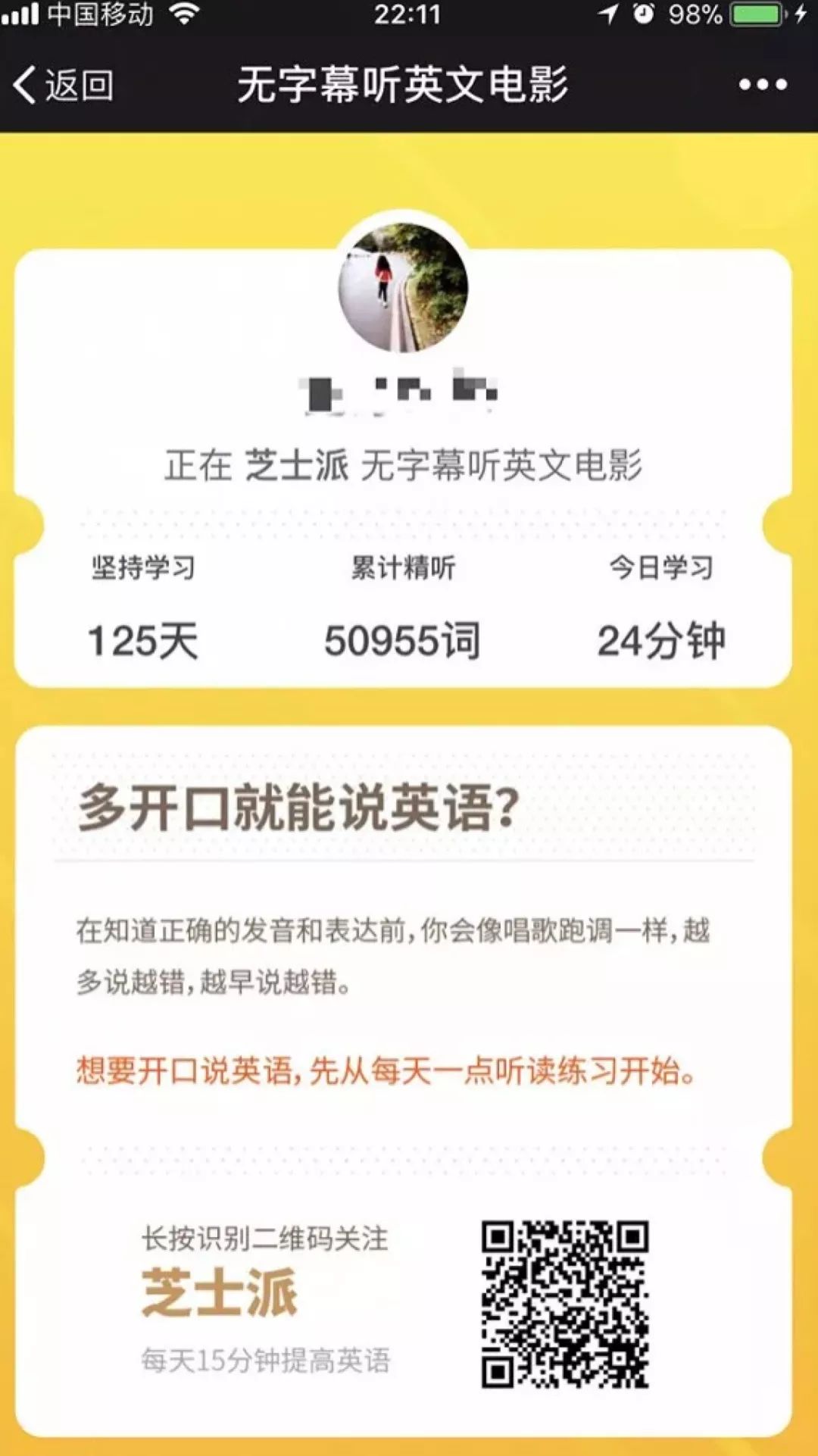 “XXX正在芝士派无字幕听英文电影,坚持学习XX天,累计精听XX词”、“扇贝打卡第XX天,阅读了X篇文章,学习时间XX分钟,等你来改变”……类似的分享语在我们的朋友圈里刷屏了有一段时间了。一个人打卡有点傻,两个人打卡不稀奇,但如果十几二十个人天天打卡呢?会不会鼓动起你的好奇心,跟着开始自己的第一本原版书的阅读,或第一次原版电影的听力练习?