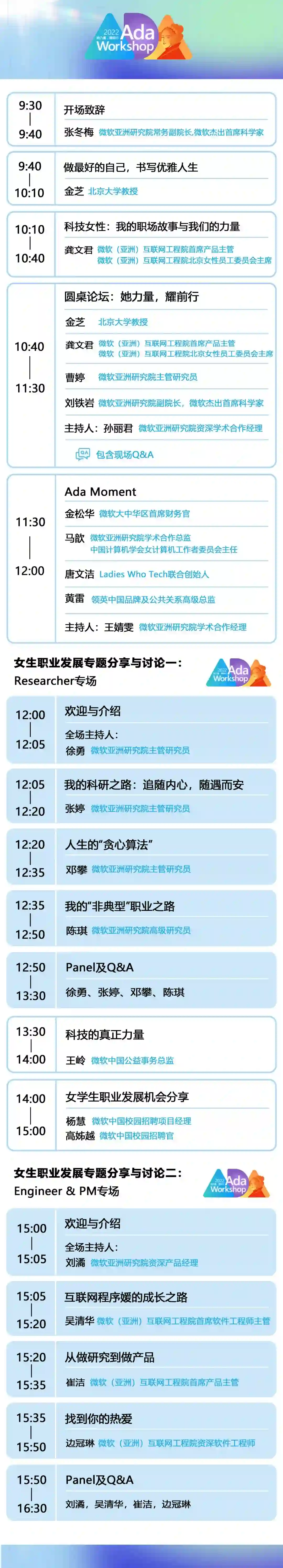 Ada Workshop 2022 女生职业发展专题日程来啦!微软女研究员、工程师与产品经理的精彩日常