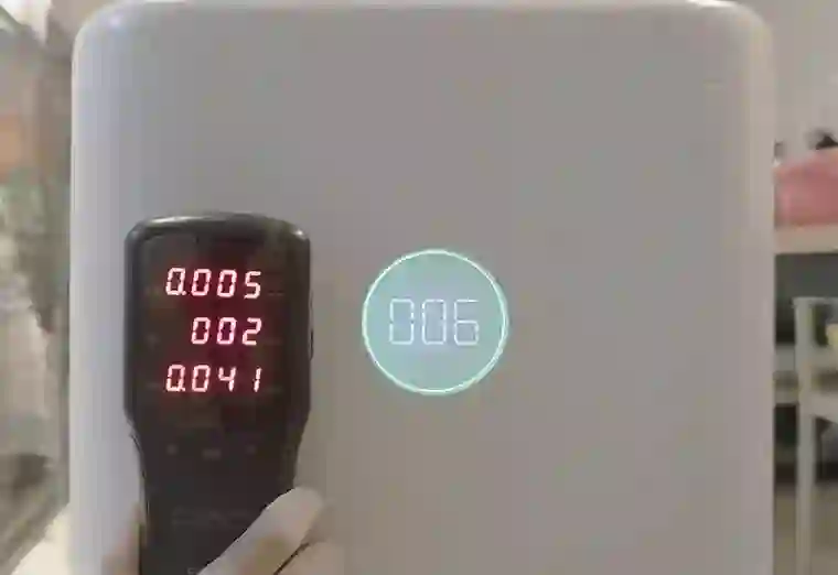 我们继续开启净化器极速模式,不一会儿警报声停止。不到 1 分钟,检测仪指数低于 0.08 mg/m³,回到安全水平。