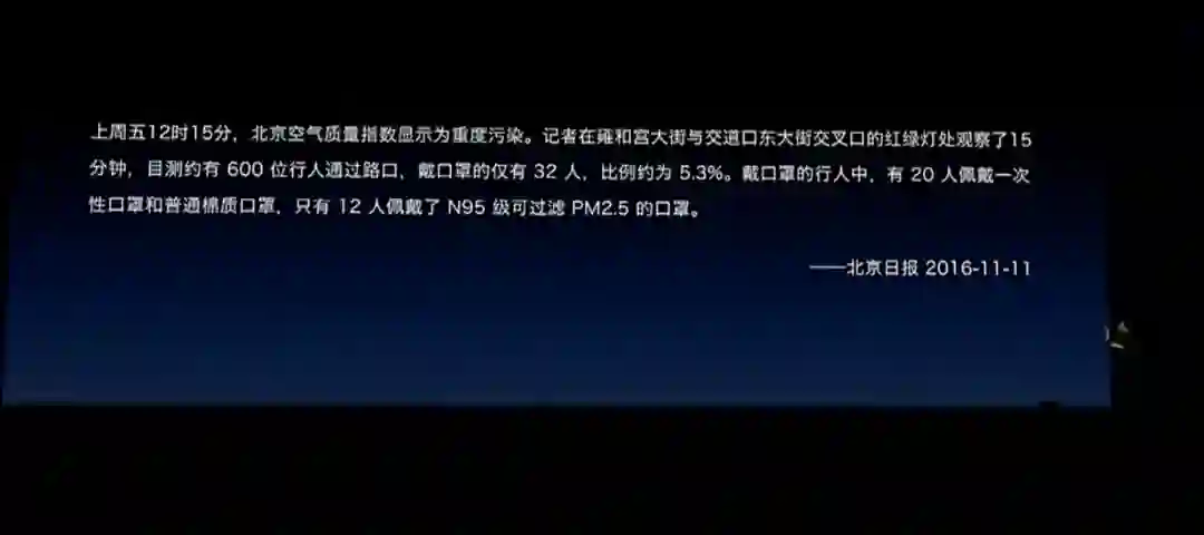 2016.11.11 北京空气质量为重度污染。记者在雍和宫大街与交道口东大街交叉口的红绿灯观察了 15 分钟,目测约有 600 位行人通过路口,戴口罩的仅有 32 人,比例约为 5.3%。戴口罩的行人中,有 20 人佩戴一次性口罩和普通棉质口罩,只有 12 人佩戴了 N95 级可过滤 PM2.5 的口罩。