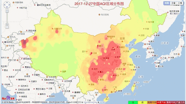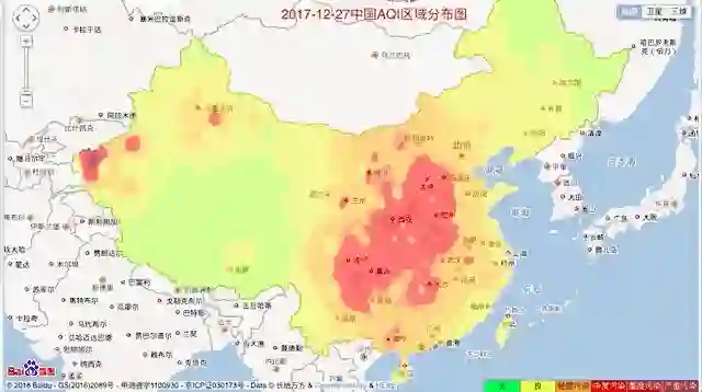 这张图是 2017 年 12.27-12.30 四天内全国空气质量情况。严重时近半个国家就像被巨大的火舌吞噬着。