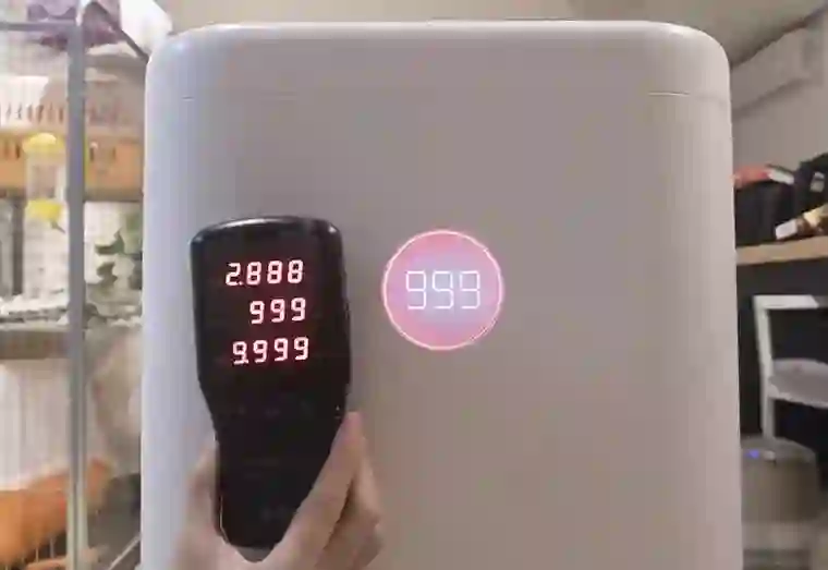 为了检测畅呼吸去除甲醛的能力,官舍君将闲置了很久的指甲油靠近畅呼吸和检测仪,检测仪指数迅速飙升到 1.555 mg/m³,并发出警报声。