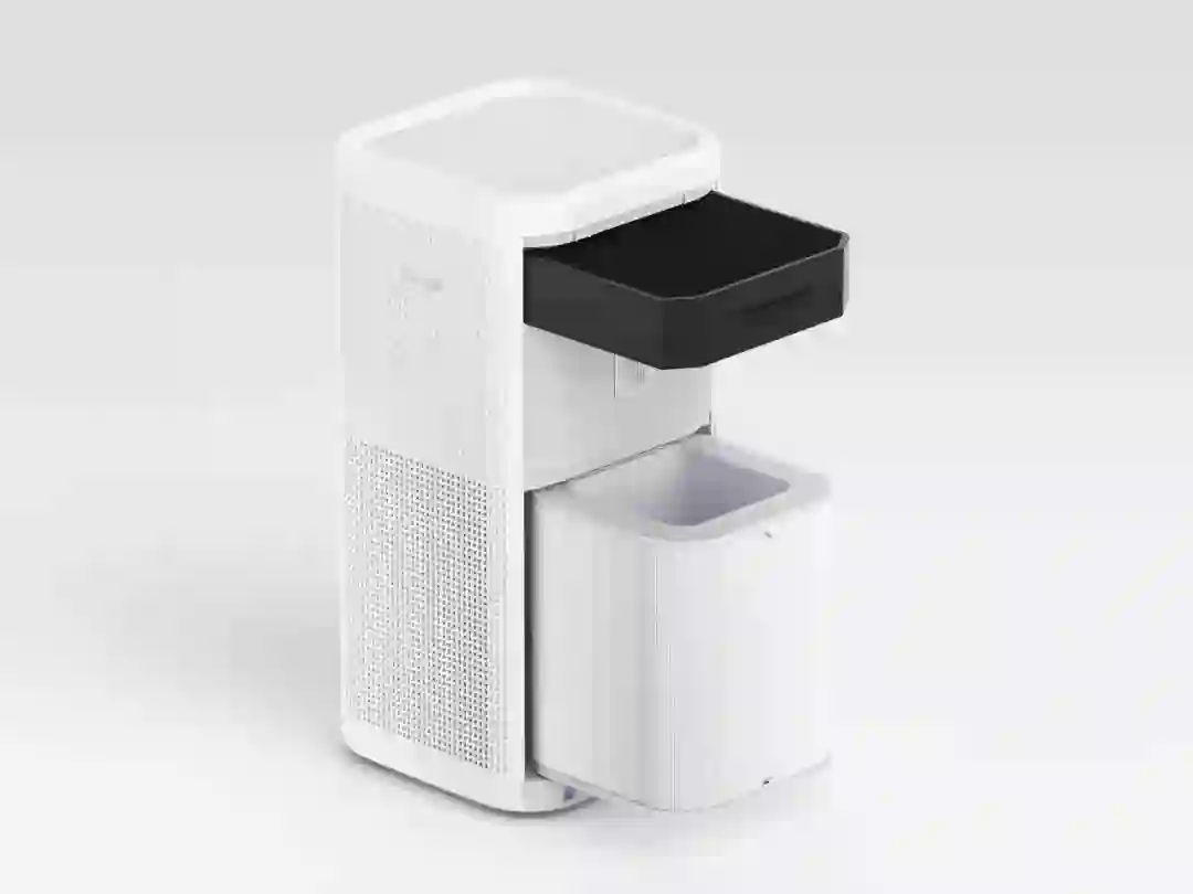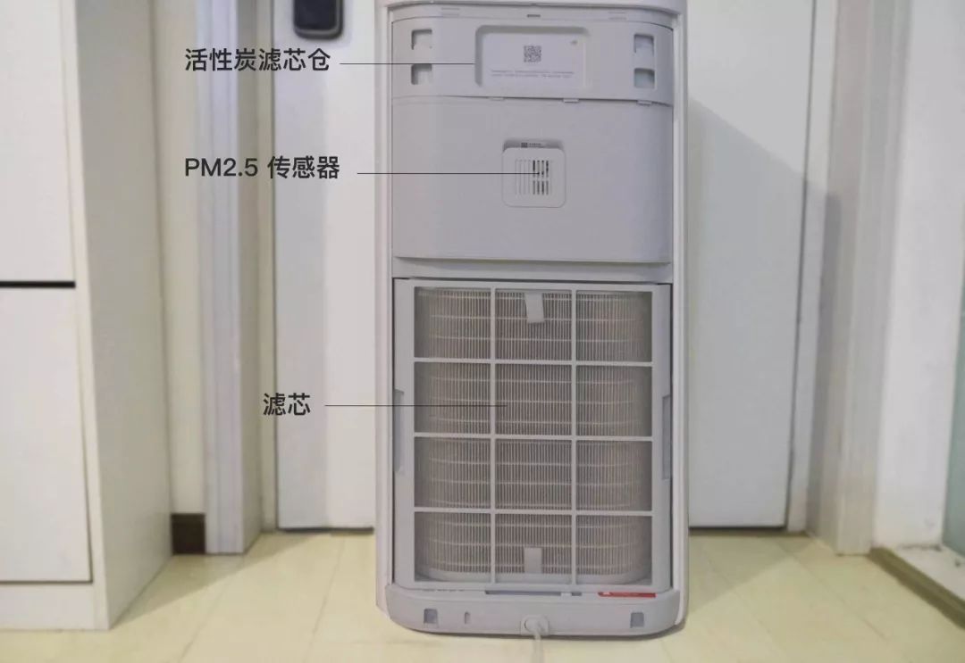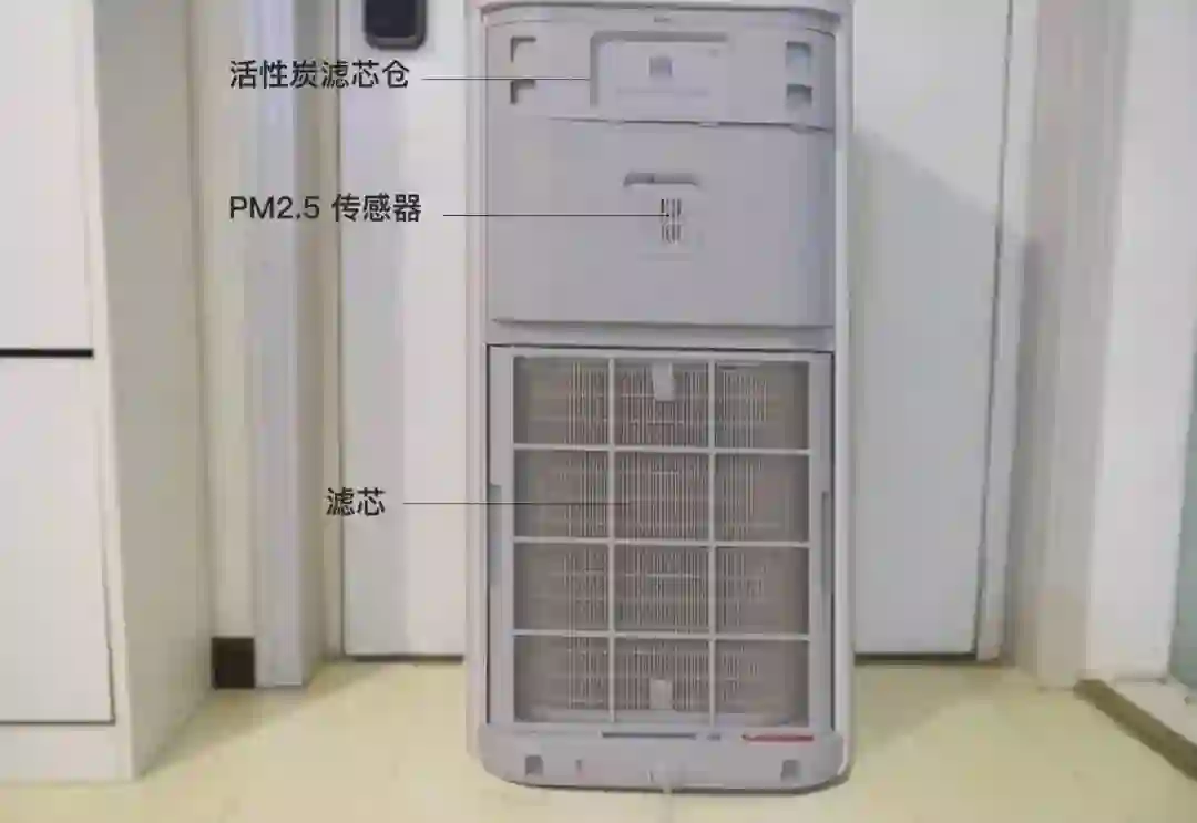 净化器分为上中下三部分。顶部预留了一个增强活性炭滤芯的仓位,中间则是电机部分,PM2.5 传感器也位于这个部分,底下的区域用于放置滤芯。