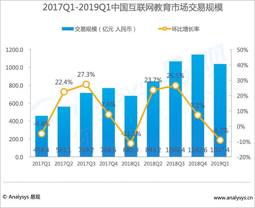 根据Analysys易观监测数据显示,2019年第1季度中国互联网教育市场整体交易规模达到1037.4亿元人民币,环比下跌9.2%,同比增长52.1%。本季度,教育市场受季度因素影响,例如春节、寒假的到来等,交易规模略微下跌。