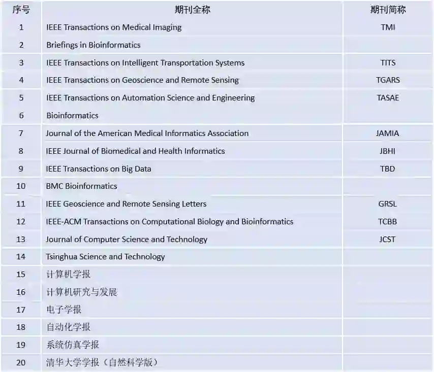 在人工智能与模式识别方向,清华推荐了 12 个 A 类会议,17 个 B 类会议;A 类期刊 6 个,B 类期刊 33 个。