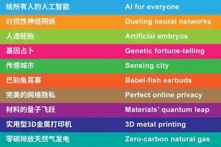 图 | 2018 年《麻省理工科技评论》全球十大突破性技术榜单包括:给所有人的人工智能(云端 AI)、对抗性神经网络、人造胚胎、基因占卜、传感城市、巴别鱼耳塞、完美的网络隐私、材料的量子飞跃、实用型 3D 金属打印机、零碳排放天然气发电共 10 大突破性技术。