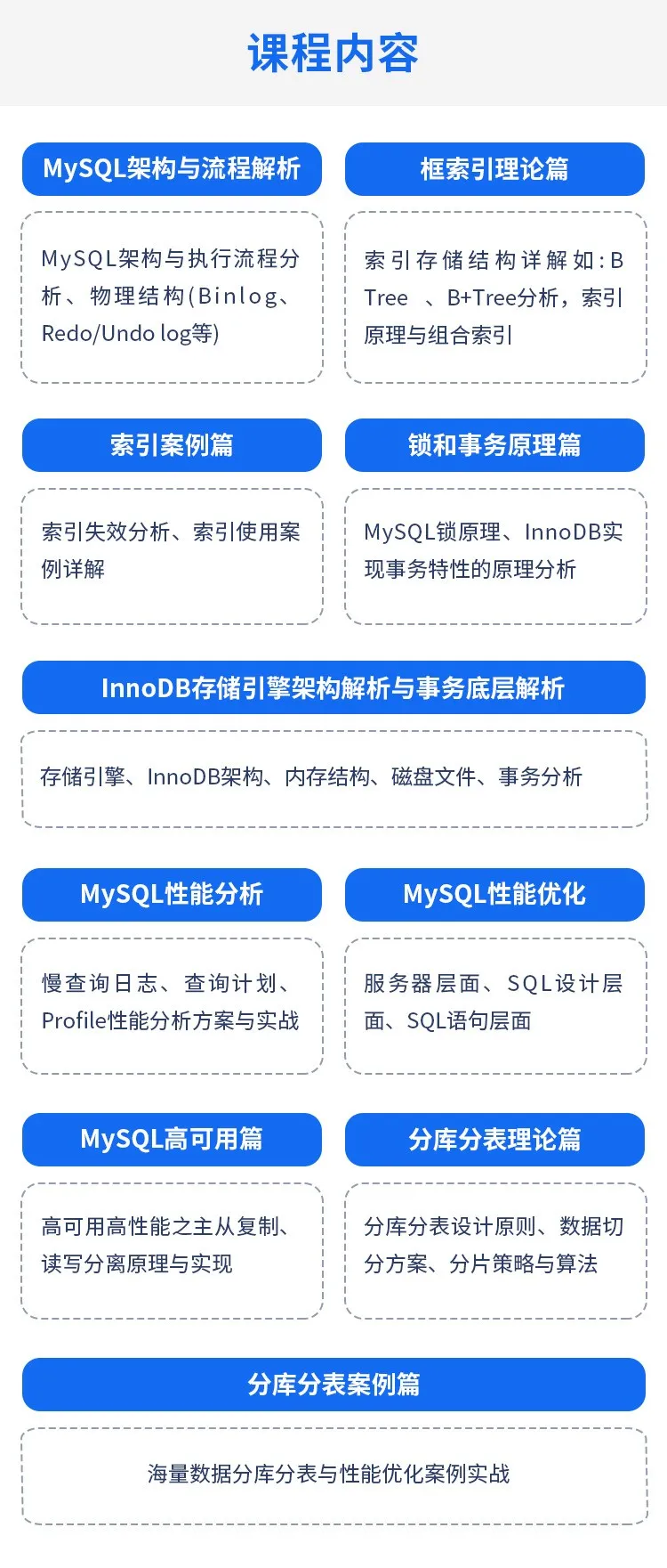 主修课周期一共 4 个月,共 6 大部分。每一部分内容都紧密匹配一线大厂的招聘需求。
