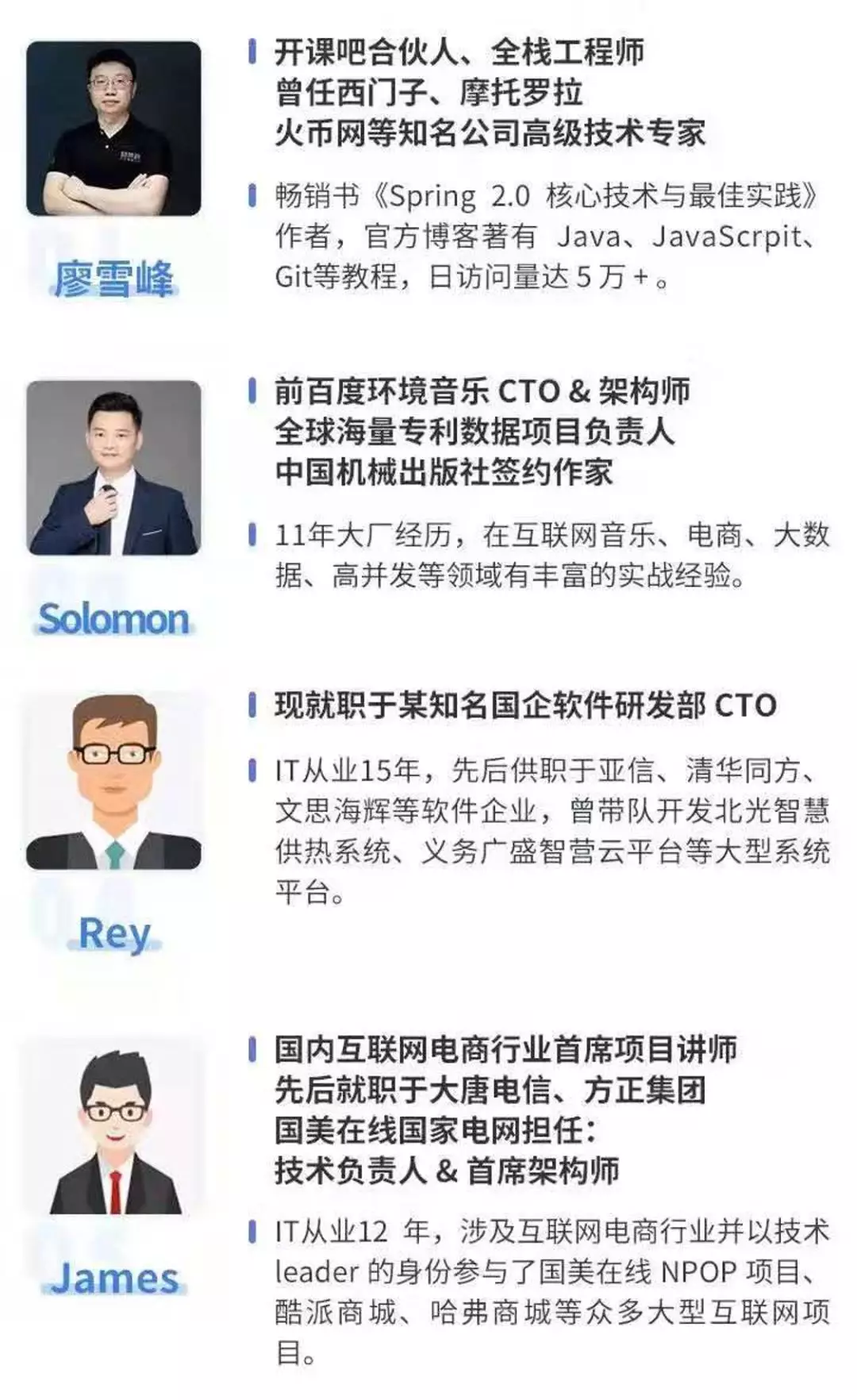 课程由廖雪峰老师亲自操刀,授课讲师均来自国内知名互联网企业并担任技术负责人,更有阿里 P9 级别的神秘大咖亲临授课,熟悉当前市场主流的技术方案和方法论。有了资深前辈的指导,可以加速个人的成长和提升。