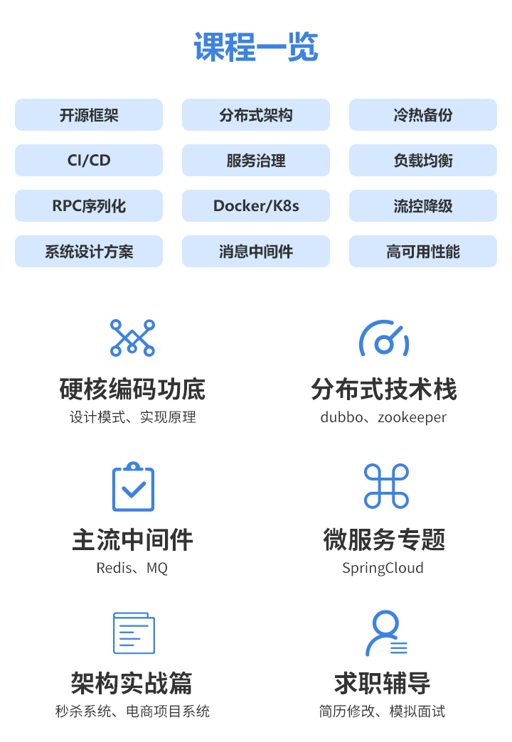 经过多期持续迭代,课程内容涵盖了互联网架构师岗位的主流需求,从编码功底到高并发实战,严格按照项目驱动的方式,从 0 到 1 教授大型互联网项目方案的开发落地,带领学员了解完整的架构演进历程与设计思路,知识体系如下:
