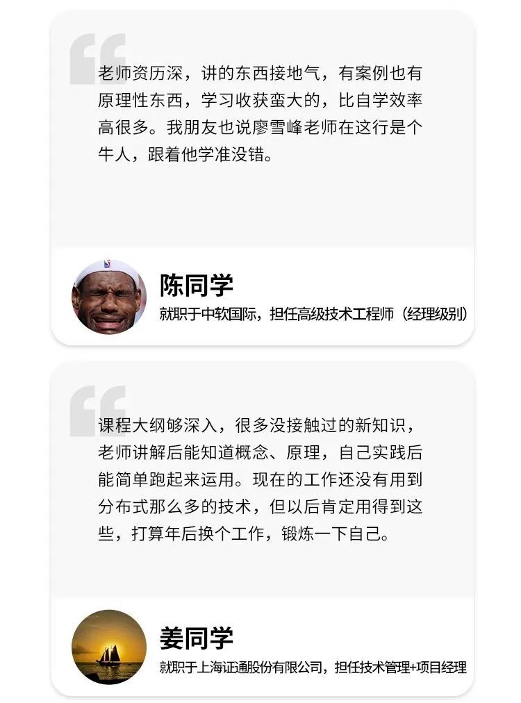 至于如何学习才能掌握这些能力,还是建议听听前辈们的经验。这里,为你推荐下开课吧廖雪峰老师的 Java 高级架构师课程。同时,现在报名的话,还能赶上正在火热进行的「开课吧战疫培优计划」。