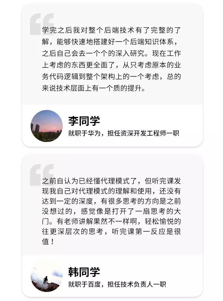 目前该课程已开设 14 期,超过 3000 人参与报名学习。截止目前,许多结课学员拿到了阿里、百度、腾讯、微软、蚂蚁金服等知名互联网公司的 Offer 。据不完全统计,目前已有超过 83% 的学员得到升职加薪的机会,平均涨薪幅度超过 5k 元 / 月 。