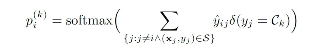 c)在数次的节点、连接边特征迭代更新之后,我们可以从最近更新的边特征上得到最终的节点类别预测,用非常直接的加权投票(weighted voting)方法,结合支持集 S 里的样本标签以及它们与查询样本连接边的预测值,我们就可以很容易的推出待查询样本的所属类别,节点的预测概率可以表达为:
