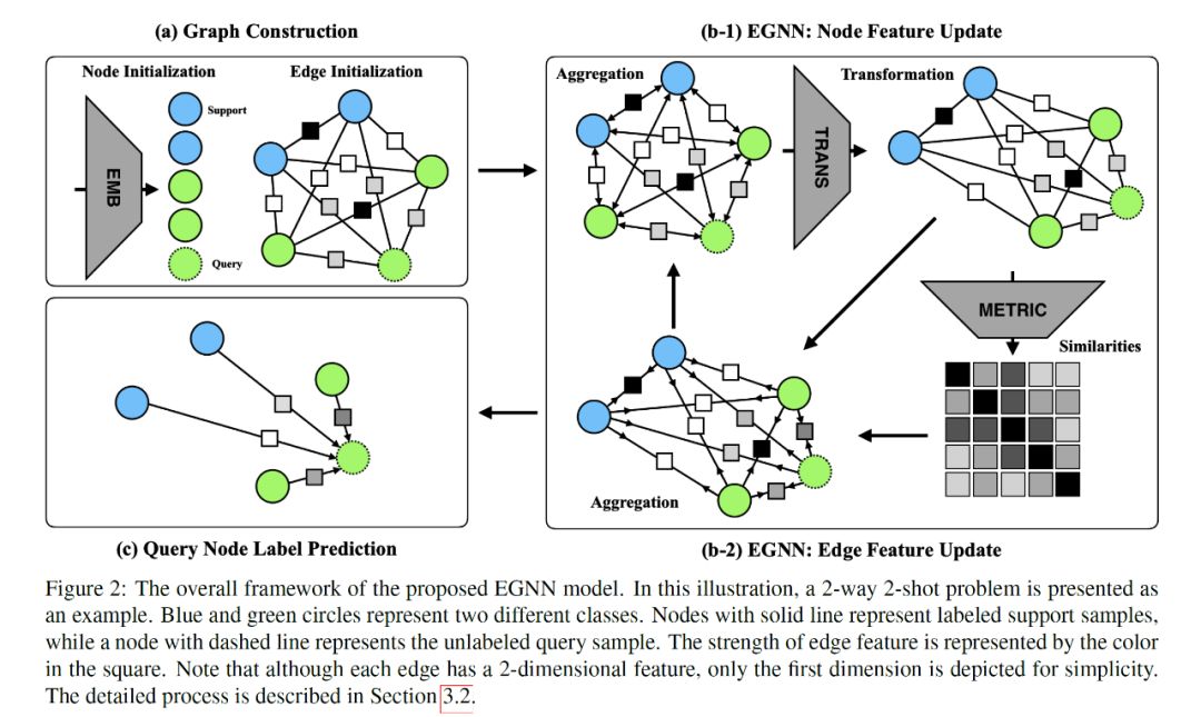 常见的图网络关注于节点的表示与特征嵌入,为了更充分的利用节点的关联信息,本篇论文提出了边标记图网络(Edge-Labeling Graph Neural Network,EGNN),类比于关注节点信息的 GNN,EGNN 通过迭代更新连接边的信息直接可以反映节点之间的类内相似度(intra-cluster similarity)与类间差异度(inter-cluster dissimilarity)从而获取正确的类别分配结果。另一方面,EGNN 在无需 re-train 的情况下能很好地适应不同数目的类别,并且很容易扩展到转换式推理(Transductive Inference)上面,同时在现有的 GNN 方法中,EGNN 在分类任务上实现了大幅的性能提升。