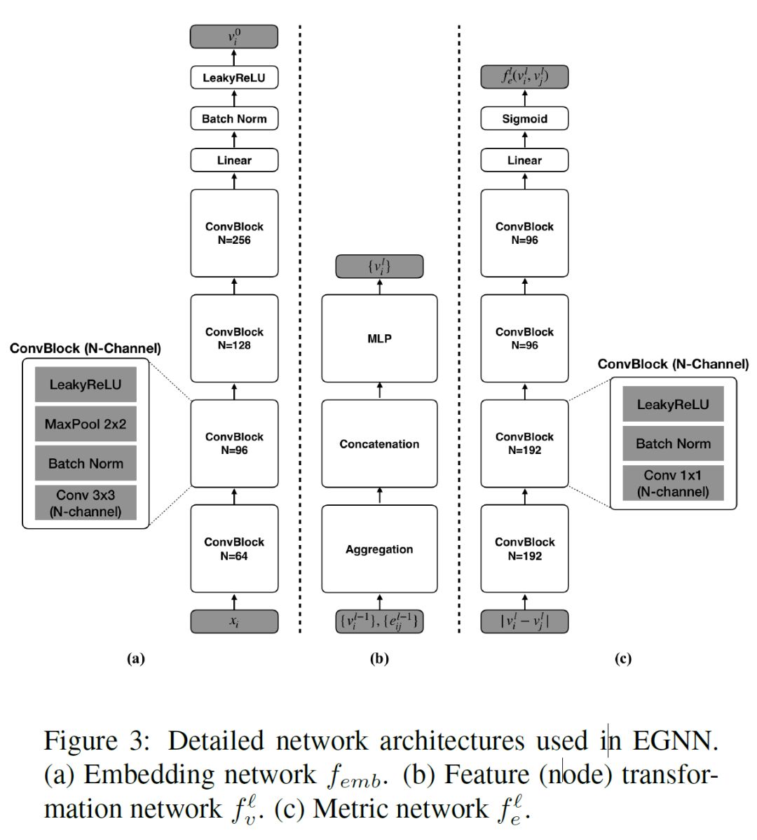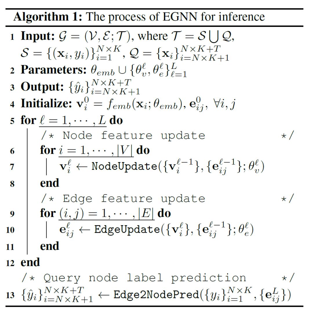 在图中首先更新节点特征,之后再更新节点之间连接边的特征,因为一组节点的特征有变化,进而也会影响到连接边上的特征,以及衡量节点之间的类内相似度(intra-cluster similarity)与类间差异度(inter-cluster dissimilarity)的参数也会对应得到更新,在边和点的特征都得到更新之后,计算边损失(Edge Loss),用 episodic training 的训练策略来更新 EGNN 的权重。
