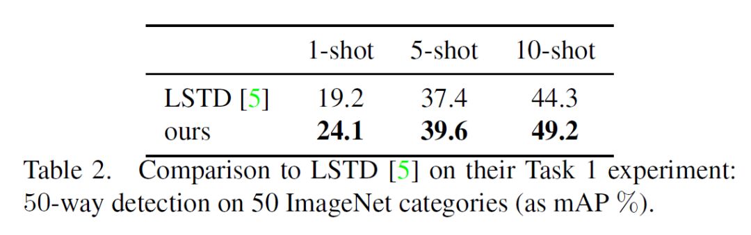 另一方面,在少样本的检测任务上,RepMet 与现有的唯一一个 LSTD 方法做了对比,取得了当前最好的少样本检测精度: