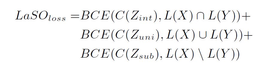 LaSO 模型接受一对图片 X,Y 为输入,分别进入骨干网络 B(文章采用 InceptionV3 以及 Resnet 作为特征提取网络)进行特征提取得到特征 Fx,Fy。在对两张图片的特征进行连接之后,根据我们希望学到的图像中个体类别的交,并,补,所以连接好的特征分别进入 LaSO 的交、并、补网络模块 Mint,Muni,Msub 中学习合成对应的特征 Zint,Zuni,Zsub,特征 Z 可以认为是对应着一张假设的图像 I,这张图像 I 中的个体类别恰好对应着输入 X,Y 的标签的并/交/补,举例说明 Zint 可以看做假设图 I 的提取特征,而图 I 的标签 L(I)正是输入 X 与 Y 的标签交集。