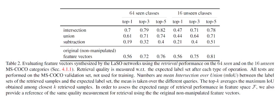 在实验过程部分,论文主要采用了 MS-COCO 2014 与 celebA 的数据集来进行实验和对比分析,将 COCO 数据集的 80 的物体类别随机分成 64 个已知类别与 16 个未知类别,并且使用平均精度(mean Average Precision,mAP)来衡量 LaSO 模块的学习能力,结果具体如下: