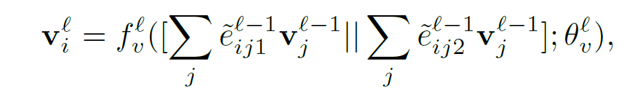 在完整观察 EGNN 结构之前,我们先理解 EGNN 里的节点与对应的连接边信息的基本更新方式: