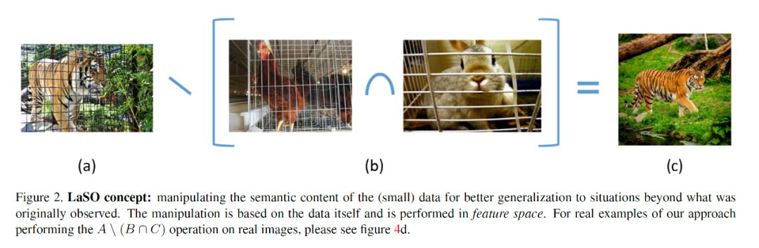 举例子来说明:我们希望训练一个野外各种类动物的分类器,然而目前我们手上仅有的却都是少量的关在笼子里的动物样本图片,笼中动物显然无法很好地泛化和学习到野外动物的特征表示,所以在 LaSO 提出的场景下,我们先将一张笼中公鸡与一张笼中兔的图片配位一对输入到网络中,让 LaSO 不只是学习到兔和公鸡的特征,同时还有我们完全没有涉及的笼子的特征,而笼子的特征恰好是两张输入图片的交集(intersection),我们取出这样的交集特征,同时再次输入一只笼中老虎的照片获得笼中虎特征,此时对笼中虎特征求它与笼子特征的补集(complement),我们从一定程度上就获得了「无笼子」的野生老虎的特征了,示意图如下: