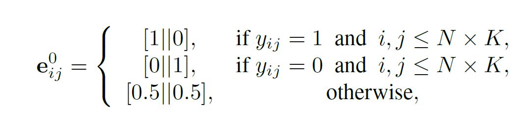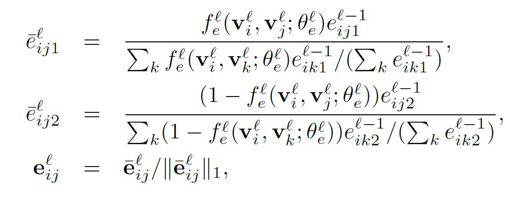 至于边的特征 e 我们一个数值范围在 [0,1] 区间内的二维向量来分别表示该条边连接的两个节点类内相似度(intra-cluster similarity)与类间差异度(inter-cluster dissimilarity),图网络同样也是多层网络,每层均可以按照类似的规则进行初始化。