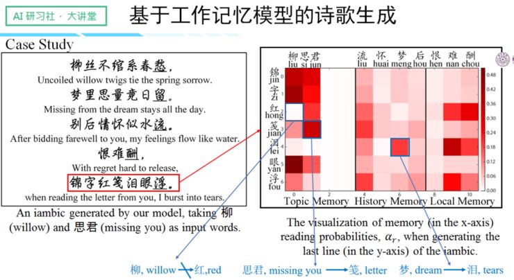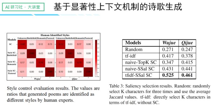 右边是人类评测的结果,对角线越明显,说明风格的识别率越高。一下生成十种风格的诗歌,还能取得这么高的识别率,说明实验的结果非常好。