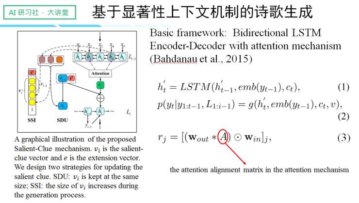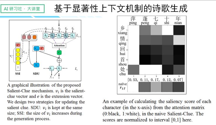 第一个模型被称作「基于显著性上下文机制的诗歌生成」,在这之前,针对中国古典诗歌自动生成的一些工作在新颖性、韵律和关键词插入有了显著提升,然而在上下文关联性方面还有所欠缺。前期的试验中,我们发现这也是自动诗歌生成系统的硬伤部分。