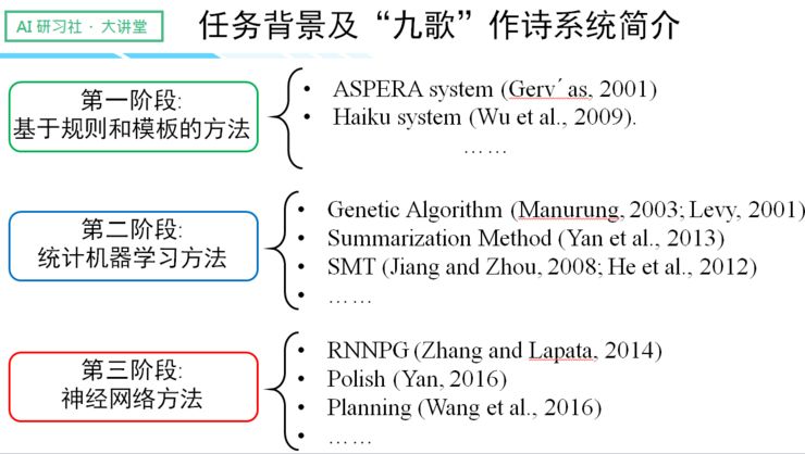 关于自动诗歌的生成,业界的研究主要经历了三个阶段: