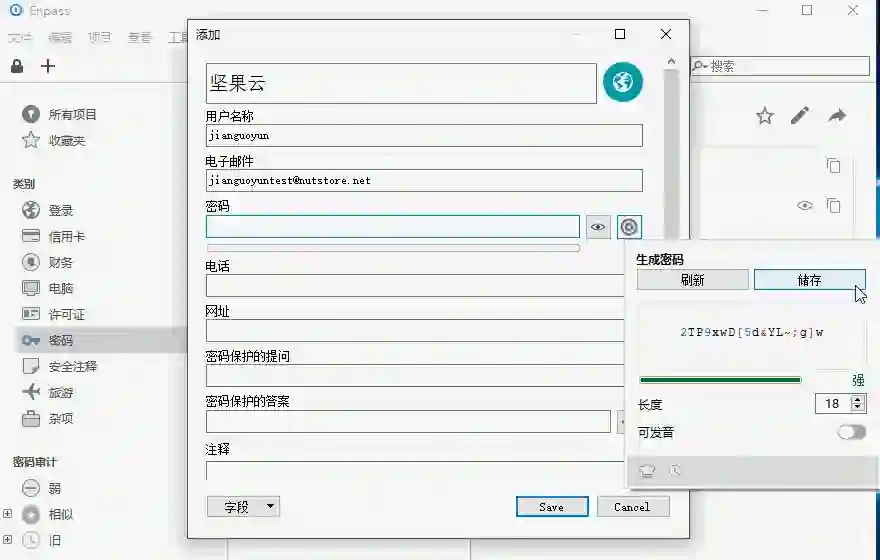 以下是 Enpass 电脑客户端界面,针对不同的使用场景,设置了例如登录、信用卡、财务等类别,可以分别进行填写。在设置密码时可以选择自己手动添加或者系统自动生成自己想要的位数的复杂密码。另外,可以设置无操作几分钟后自动上锁,防止离开后他人打开查看。