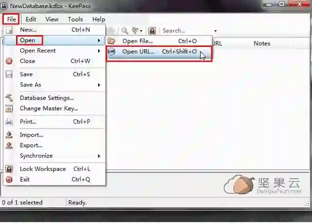 或者打开选择 URL 的方式,使用 WebDAV 连接到坚果云,不用下载密码库文件到本地,直接打开之前存放在坚果云云端里的密码库文件,URL 地址:坚果云服务器地址,账号:坚果云注册账号,密码:坚果云第三方应用密码(注意:非登录密码)。