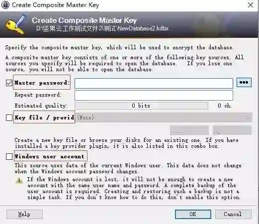 选择数据库保护方式,包括以下三种类型:主密码,密钥文件,Windows 用户帐户,三种方式可以叠加使用,所以 KeePass 的安全性还是非常高的。