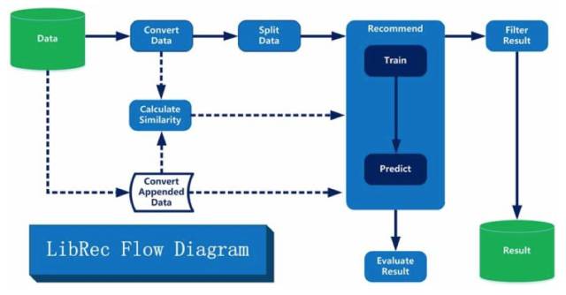 基于LibRec来运行推荐算法就如同搭积木一样简单,其工作流程如上图所示。首先设置好相关参数配置,然后实例化数据并测试分割,调用推荐算法训练学习,最后对推荐结果进行过滤和评估。示例程序:
