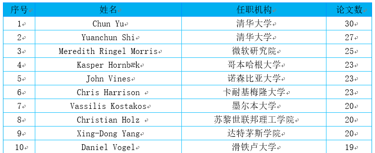 报告中的人才篇,对人机交互领域的顶级学术会议及期刊论文进行系统性的筛选和深入的挖掘,以全球视角对人机交互领域顶尖学者的地区分布、国家分布以及性别差异进行统计分析,并对中国专家学者的分布情况、国内外的人机交互领域的代表性学者的个人基本情况和主要成就进行了简要总结。另外,报告还对近三年在所选期刊或会议上发表论文数最多的 100 名学者进行了统计排名。下表展示了人机交互领域近三年的高产学者名单前十名。
