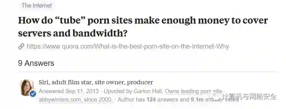 美版知乎Quora上有人问过“色情网站如何赚足够的钱来支付服务器和带宽?”的问题,拥有“成人电影演员”身份认证的用户Siri是这样回答的: