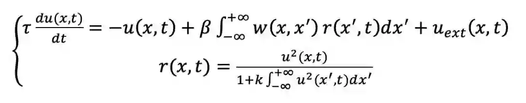 这里给大家介绍比较典型的连续吸引子网络(Continuous Attractor Neural Network, CANN)[21,22],其神经元模型可以简单总结为如下: