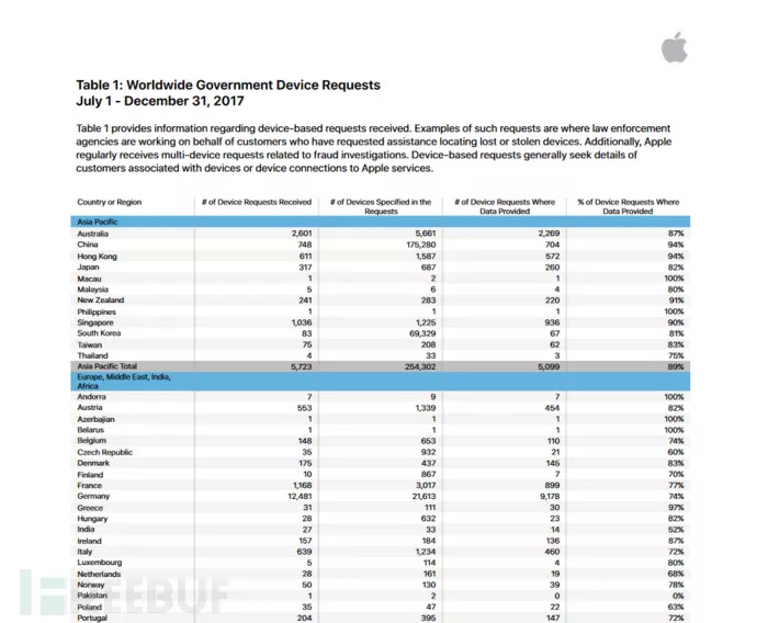 根据苹果公司公布的2017年下半年透明度报告来看,包括美国、中国在内的众多国家向苹果提出了多达 3358 次要求共享用户个人用户信息的请求,主要围绕iCloud,包括个人照片、日程表、联系人、电子邮件等等,甚至是设备备份数据,苹果答应了其中的21%,而数据用途也基本都是用来破案。