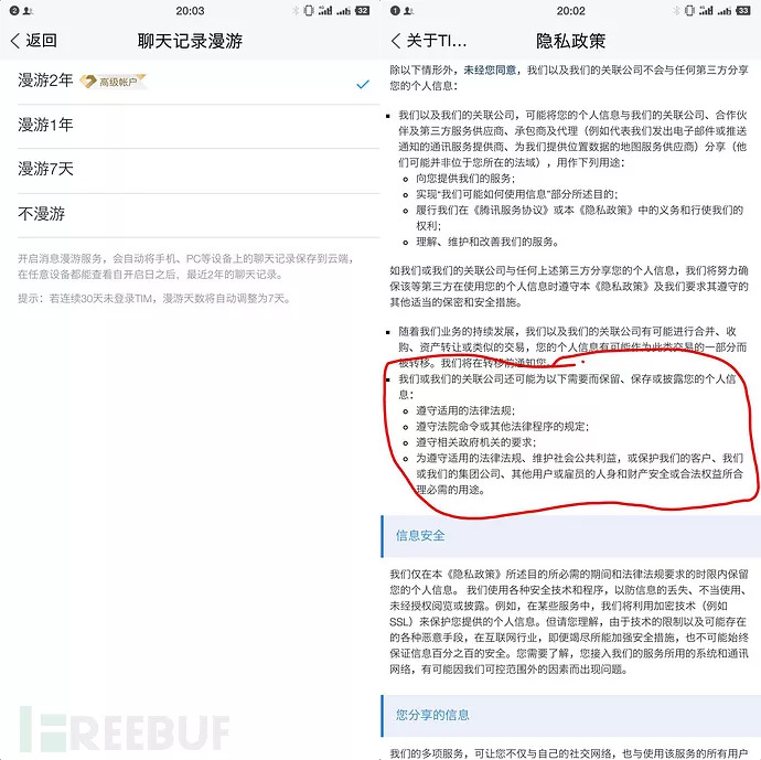 以QQ为例,QQ聊天记录是支持云端漫游的,也就是聊天信息会上传云端,最长可以保存2年。而在其隐私协议中有提到,在法院命令、政府机关要求的情况下,会披露用户的个人信息。这样能够给相关机构调查、办案提供极大的便利性。这不仅仅是腾讯,只要在国内运营的互联网企业基本都遵从这一准则,哪怕是苹多次拒绝FBI的解锁iPhone请求的苹果公司。