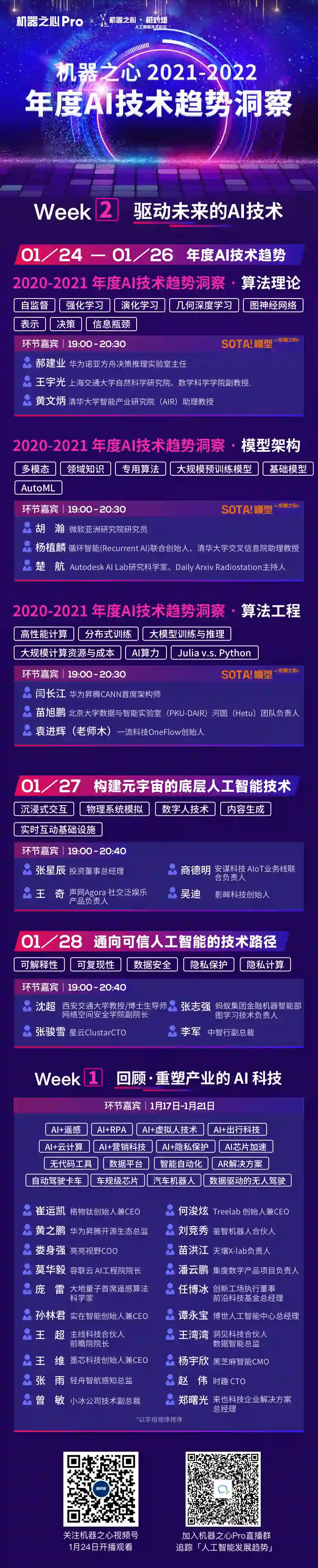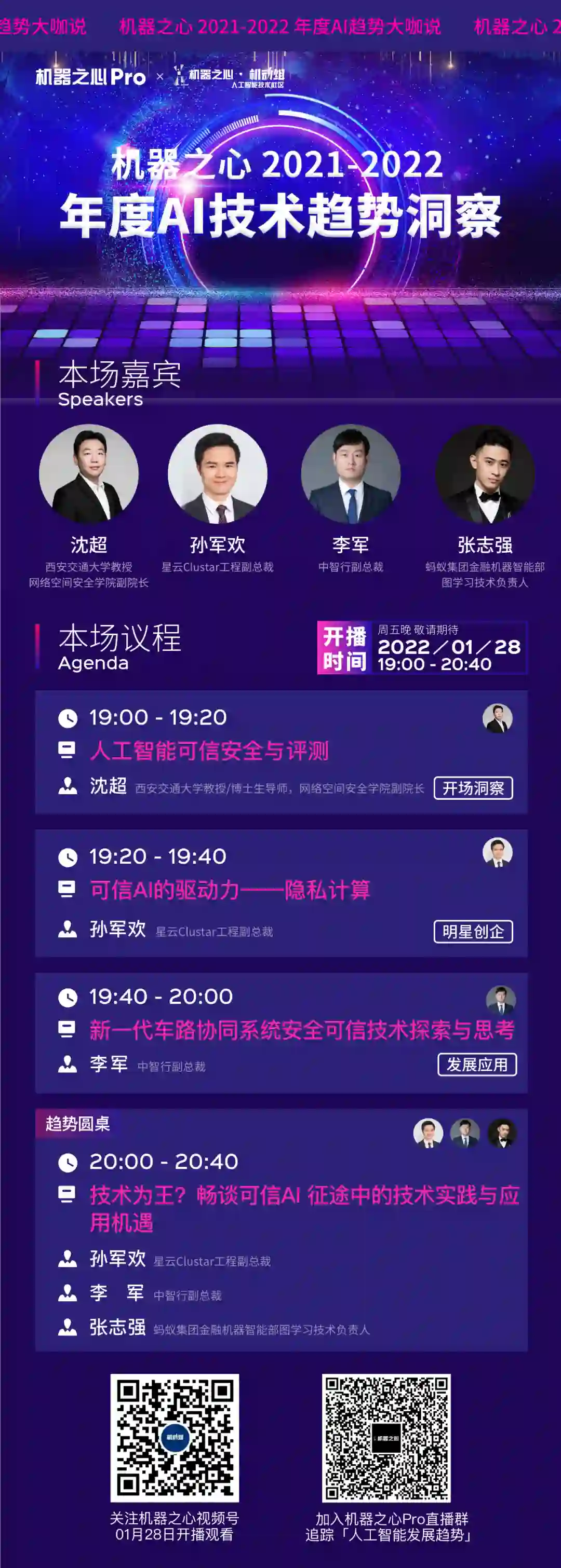 在即将到来的一年里,可信 AI 在稳定性、安全性、可解释性及公平性等方面又将遇到怎样的挑战? 2022 年 1 月 28 日晚 7 点,在机器之心年度特别策划「驱动未来的 AI 技术 —— 2021-2022 年度 AI 技术趋势洞察」的「可信 AI 专场」来自西安交通大学教授 / 博士生导师,网络空间安全学院副院长沈超、星云 Clustar 工程副总裁孙军欢、中智行副总裁李军、蚂蚁集团金融机器智能部图学习技术负责人张志强四位嘉宾将做客机器之心「2021-2022 年度 AI 技术趋势洞察」直播间,分别通过「人工智能可信安全与评测」、「可信AI的驱动力——隐私计算」、「新一代车路协同系统安全可信技术探索与思考」等主题分享介绍新一代人工智能的可解释性、可复现性、数据安全、隐私保护、隐私计算的最新进展与思考、并共同就「技术为王?畅谈可信 AI 征途中的技术实践与应用机遇」等话题进行圆桌探讨。