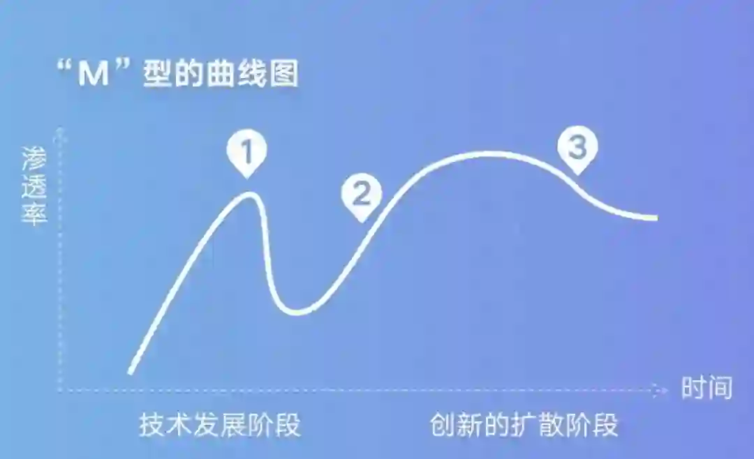 他将“技术成熟度曲线”和“创新扩散曲线”这两个分析框架连在一起,组成了一条M型曲线。