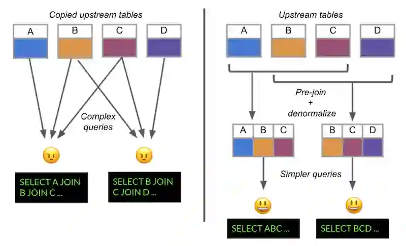此外,以前我们的数据模型严重受上游 OLTP 资源的影响,这些数据模型是高度规范化的,为行级事务而设计。然而,我们复杂的业务分析需要将这些模型转化为普通但开销大的表连接。为此,我们对表进行了去规范化和预连接,以简化我们的分析工作(图 4)。